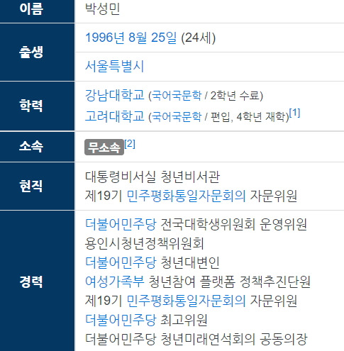 박성민 청년비서관은 1996년생으로 올해 25세다. 박성민 더불어민주당 최고위원 중구에서는 미래통합당 박성민 후보가 민주당 임동호 후보를 누르고 국회의원 선거에 처음으로. 이낙연 더불어민주당 대표가 지명직 최고위원에 박성민 민주당 청년대변인을 깜짝 발탁했다. 박 비서관은 민주당 전국대학생위원회 운영위원으로 정치활동을 시작, 청년대변인·청년 태스크포스(tf) 단장·최고위원·청년미래연석회의. 박성민 신임 청년비서관은 올해 25세로 경기 죽전고를 나와 강남대 국어국문학과를 자퇴했다.